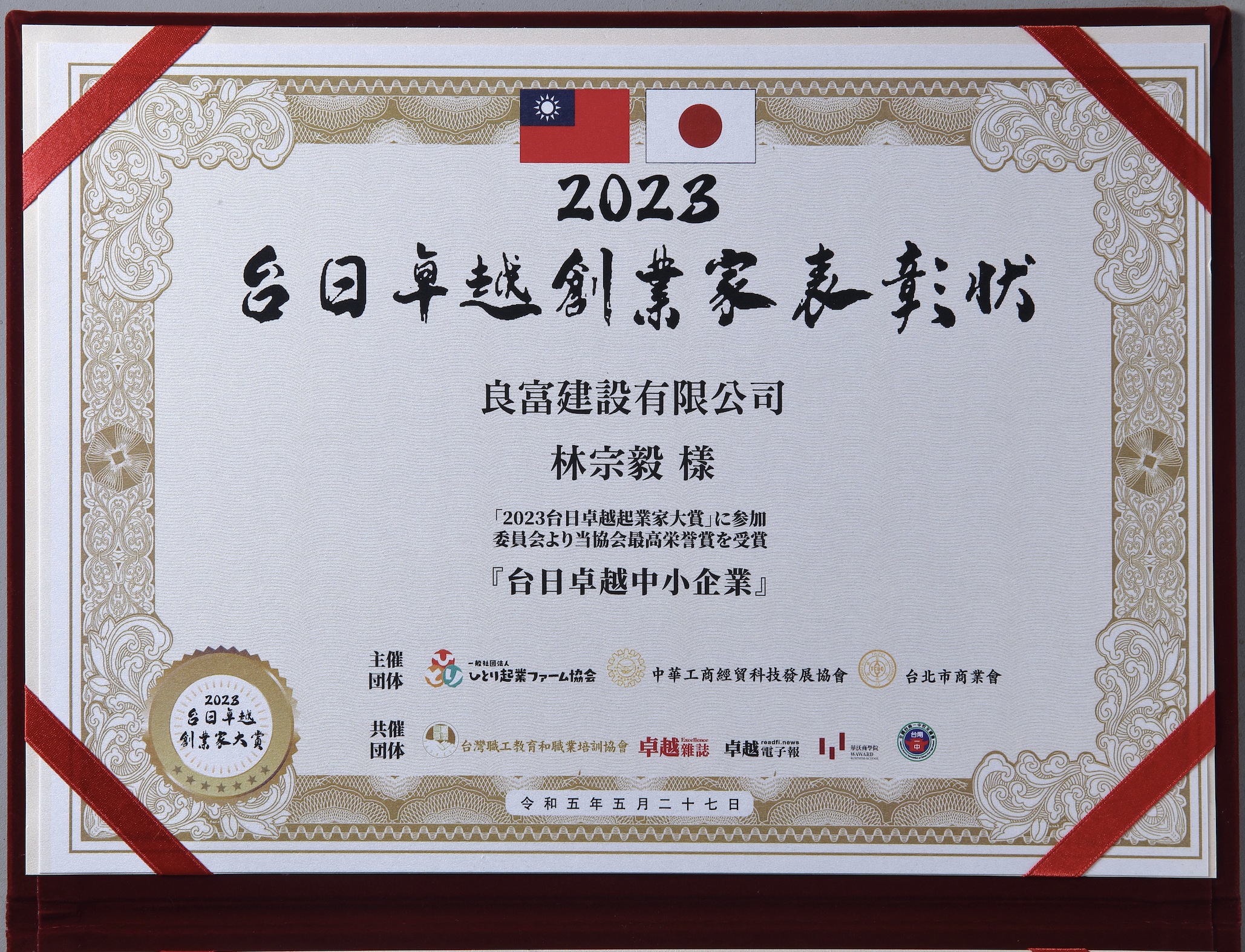 繼榮獲2022年建築金獅獎首獎、建築品質金獎、台灣誠信建商、2022年台灣第一品牌、台灣品質保證金像獎之後,良富建設今年更榮獲「2023年台日卓越創業家大賞」,晉升為台日職人精神、嚴謹品質肯定的優質企業。